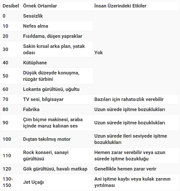 Günlük hayatta sıkça kullanmış olduğumuz araç gereçlerin çıkarmış olduğu gürültü seviyeleri (dB cinsinden) aşağıdaki tabloda gösterilmiştir. Verilen dB seviyeleri değişken olmakla birlikte insanların yaklaşık olarak kaç dB (desibel) gürültü seviyesine maruz kaldığı hakkında fikir vermektedir. Ayrıca gürültü seviyeleriyle doğru orantılı olarak insanlar üzerinde gerçekleşen olumsuz etkilerde tabloda verilmiştir.